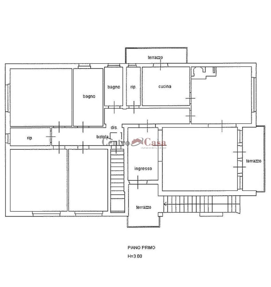Il piano primo, alto 3,00 mt. si compone di grande sala con accesso a terrazzo, sala pranzo con camino, cucina abitabile con terrazzo, tre spaziose camere matrimoniali, doppi servizi, 2 ripostigli, terzo terrazzo, ampio disimpegno d’ingresso.